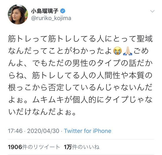 【画像】小島瑠璃子「誤解を与えてごめん。ムキムキは恋愛対象外と言いたかっただけ」←トレーニー激怒で再炎上www