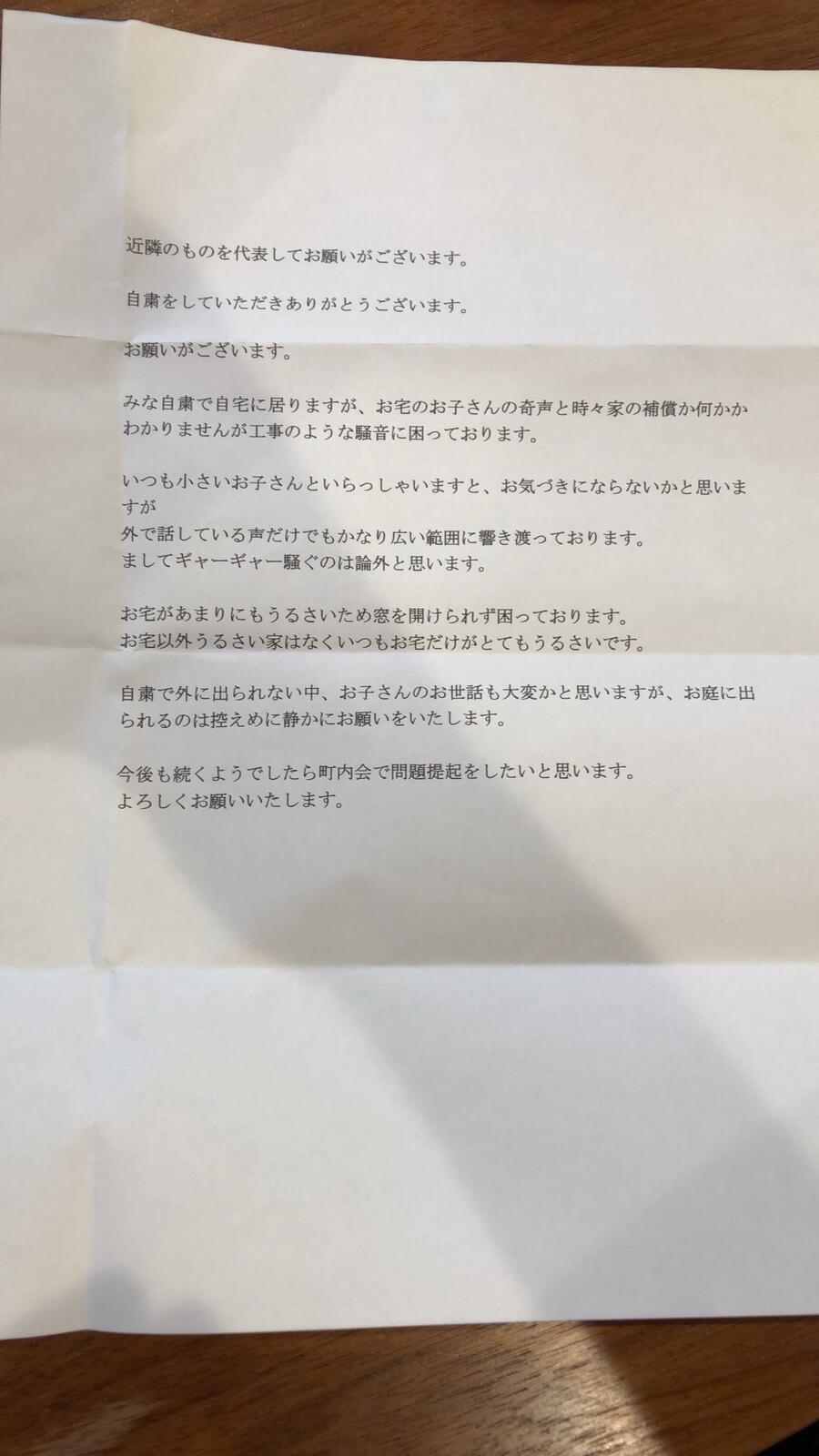 【画像あり】「子供の騒音がうるさいって苦情の手紙を送られた!自粛警察だ!」