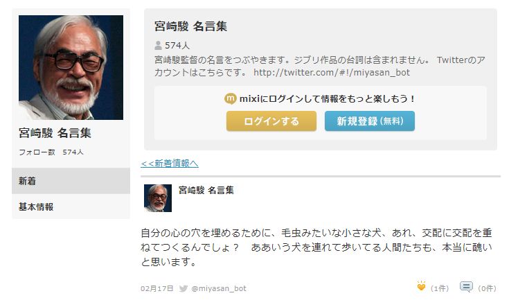 ホーム > 芸能 > 宮崎駿「心の穴を埋めるために、交配を重ねた毛虫みたいな小さな犬を連れてる人、本当に醜い」 2020/05/24 1: 風吹けば名無し 2020/05/24(日) 10:18:45.20 ID:kcKVERT80 続きを読む - 芸能