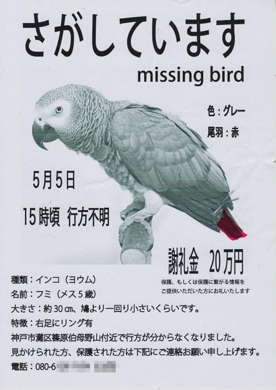 【大急募】インコ見つけてくれた人に謝礼20万円wwwwwwww