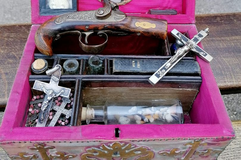 中には小さな拳銃、内容物不明の青い小瓶、ガラスの小瓶3つ、ロザリオ、十字架3本、真珠があしらわれた柄と銀製のポケットナイフ、サメの歯が入った瓶と1842年版の新約聖書が納められている。