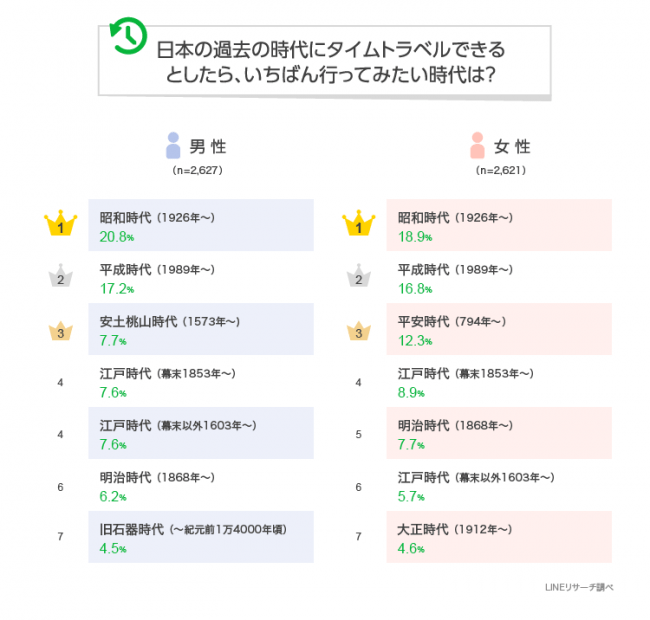 【LINEリサーチ】タイムトラベルしたい時代、男女ともに「昭和」と「平成」が圧倒的人気 年代別では40?50代は「昭和」、10?30代は「平成」と自分が生まれた時代に興味を持つ人が多数