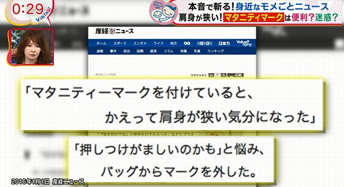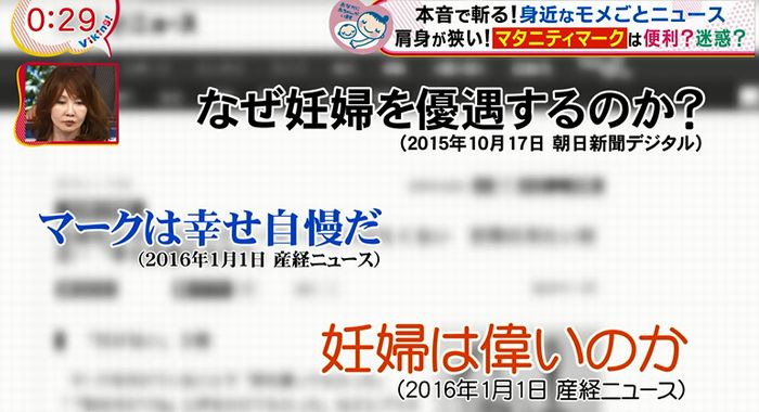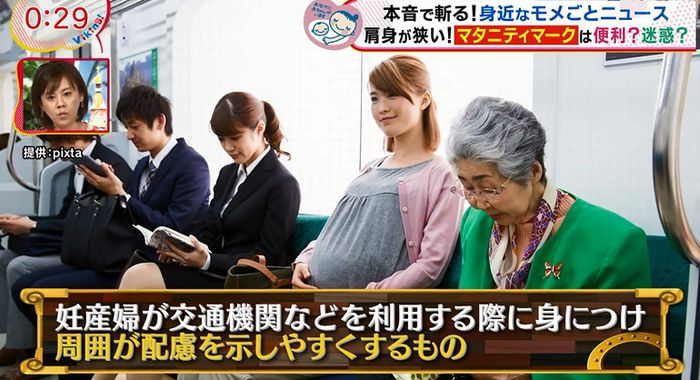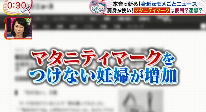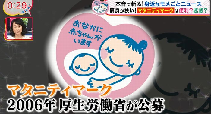 番組では「本音で斬る!身近なモメごとニュース 肩身が狭い!マタニティマークは便利?迷惑?」と題し、妊婦が利用する「マタニティマーク」について取り上げた。
