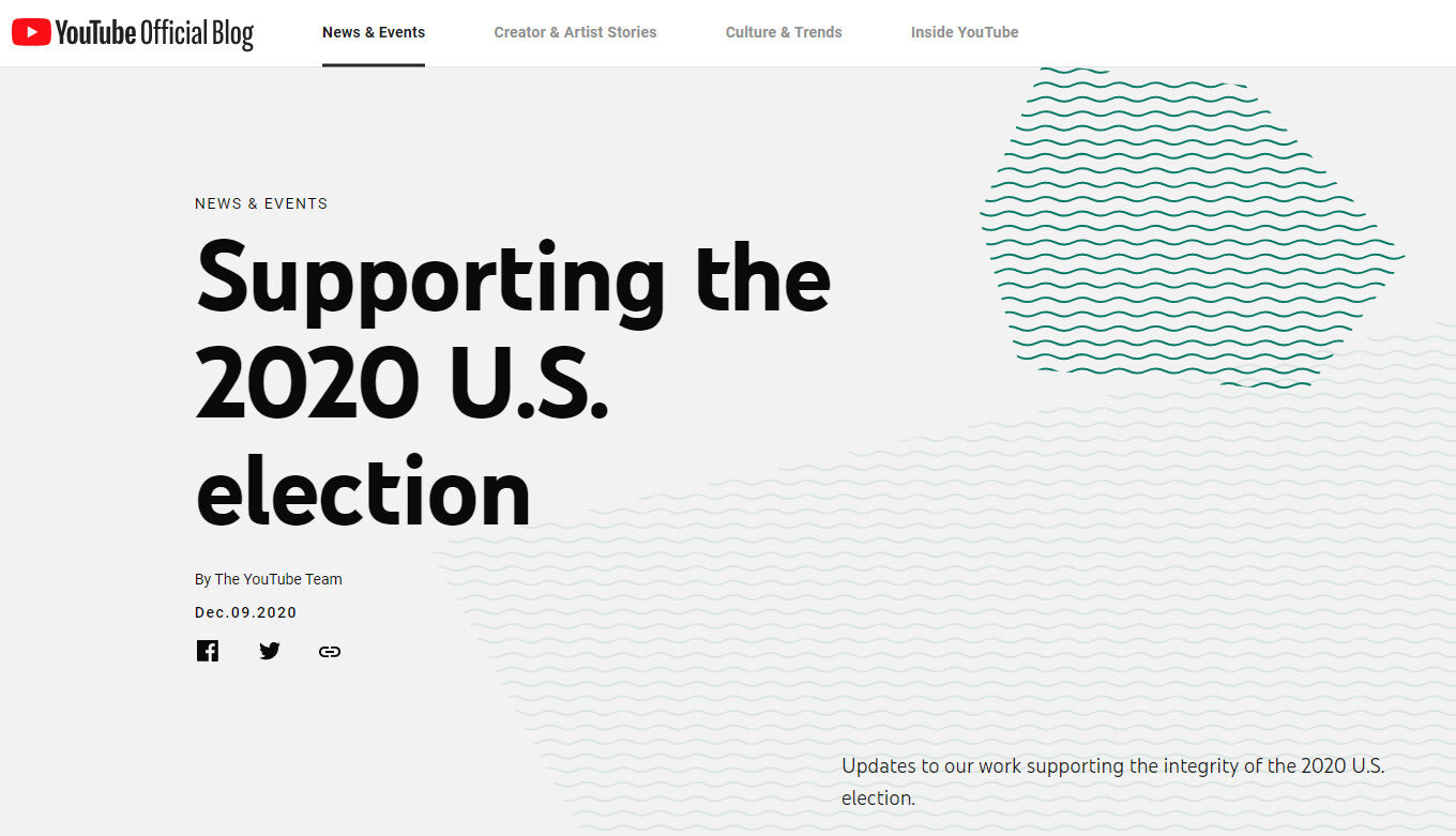 YouTubeは9日公式ブログで「今日から広範囲な間違いが2020年の米大統領選挙の結果を変えたという主張で