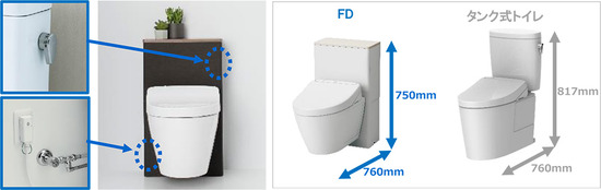 新商品の住宅用壁掛トイレ「FD」は、住宅用システムトイレ「レストパルF」で好評の浮遊感のあるフローティングデザインを採用し、高級感とデザイン性のあるトイレ空間を実現します。