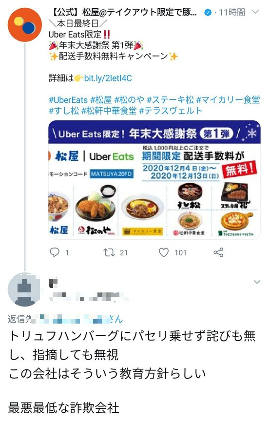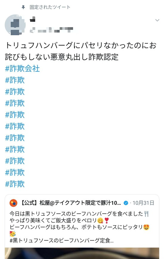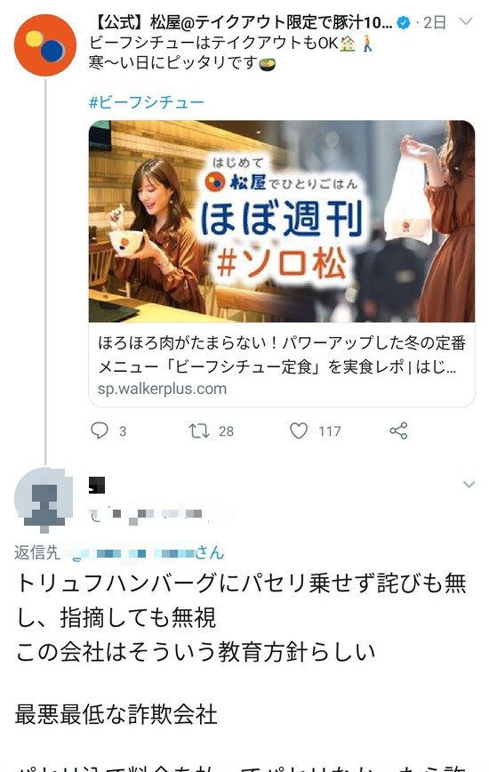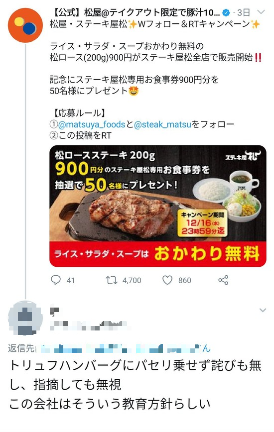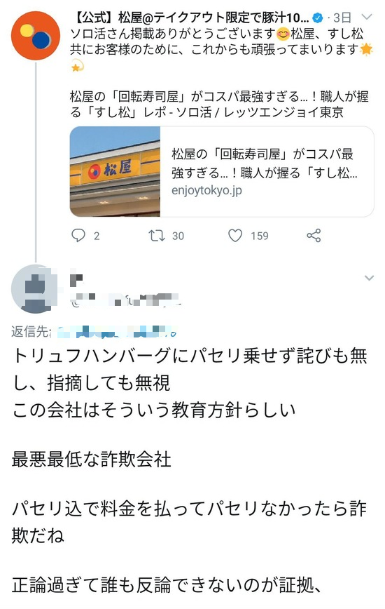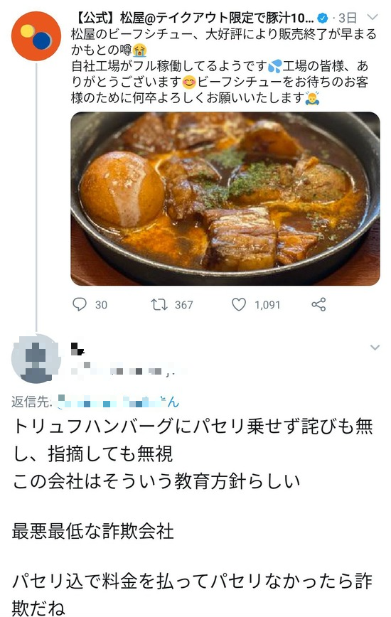 【画像】松屋の公式Twitter、変なのに粘着されてしまうwww