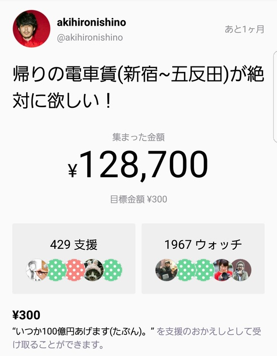 【画像】キンコン西野さん、電車賃300円をクラウドファンディングで募り128700円ゲットしてしまうwww