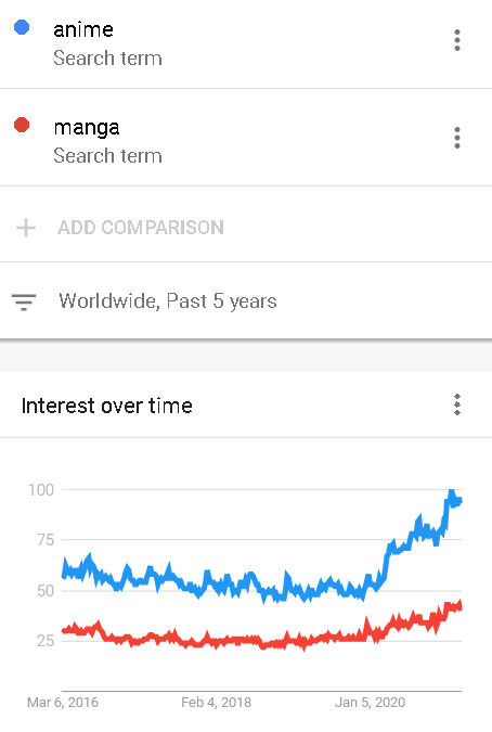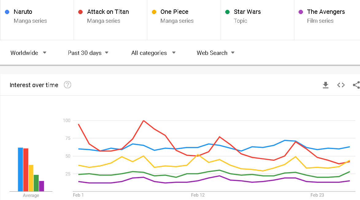 ホーム > アニメ・漫画 > 【朗報】日本の漫画とアニメ、世界で人気爆発 検索量が倍増 2021/03/02 1: プロストラチン(神奈川県) [JP] 2021/03/01(月) 19:21:24.68 ID:Rms5mTiJ0● BE:329614872-2BP(2500) Manga = 2年で検索量が倍増 Anime = 1年で検索量が倍増 世界での検索量 ナルト>進撃>>ワンピース>>スターウォーズ>>アベンジャーズ 続きを読む - アニメ・漫画
