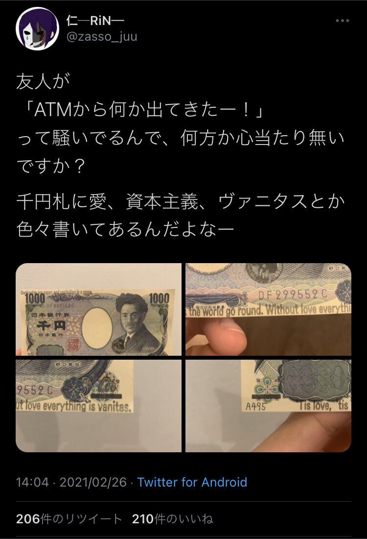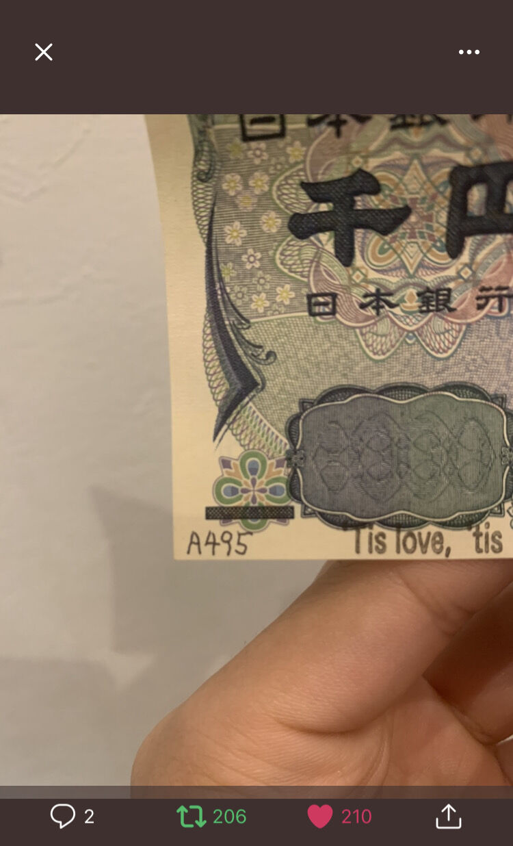 ホーム > 画像 > 暗号入りの千円札発見される 2021/03/04 1: 以下、5ちゃんねるからVIPがお送りします 2021/03/03(水) 15:57:09.700 ID:/5cTsMA100303 https://twitter.com/zasso_juu/status/1365165703393804289?s=21 続きを読む - 画像