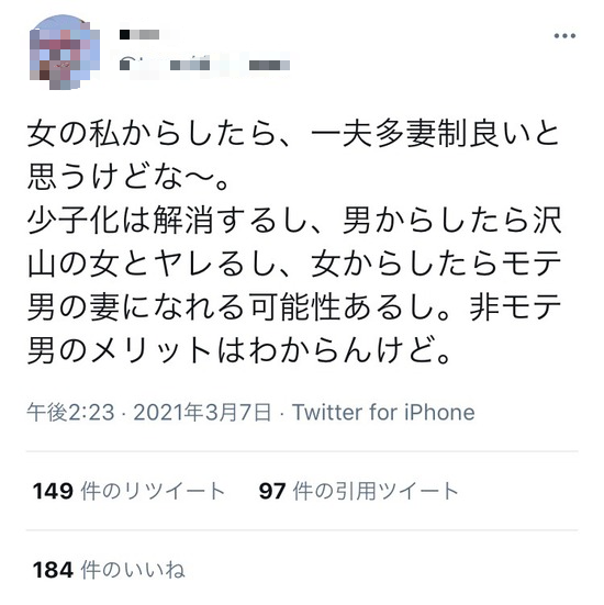 【画像】独身女子、余ってる男がゴミだらけなので一夫多妻制を要求www