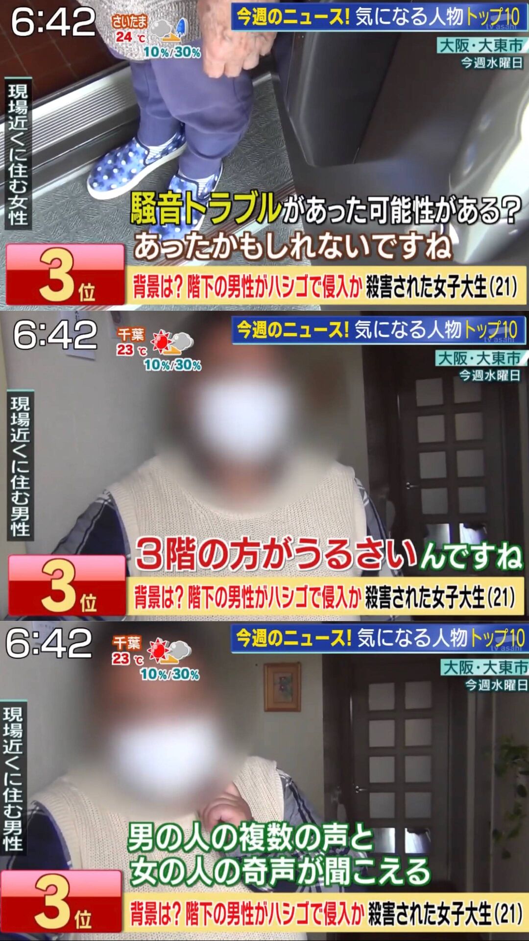 ホーム > 国内ニュース > 殺害された女子大生が住む3階がうるさいとテレビで報道 騒音問題と判明(画像あり) 2021/05/04 1: ハーフネルソンスープレックス(SB-iPhone) [ID] 2021/05/04(火) 01:46:47.19 ID:etzDmaX+0● BE:144189134-2BP(2000) 画像 犯人の男 続きを読む - 国内ニュース
