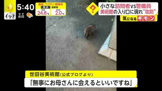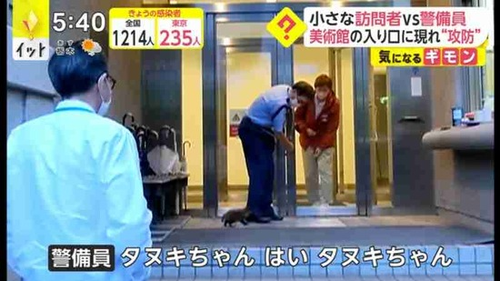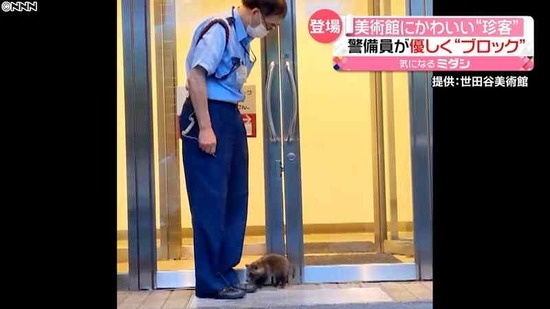 【画像】タヌキさん、美術館に入館試みるも警備員に阻止されるwww