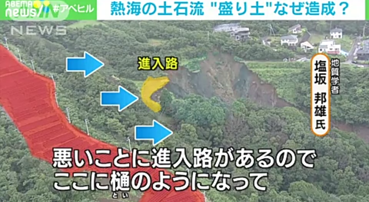 悪いことに進入路があるので、ここに樋(とい)のようになって、(土石流の起点)に水がたまって、水が全部この勾配で、ここに来ちゃった」と話しました。