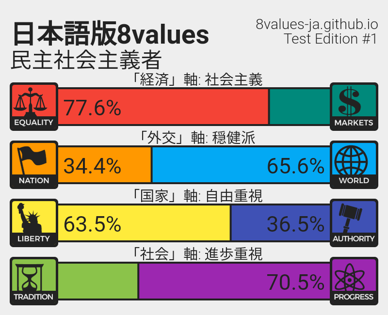 ホーム > その他 > 自分の政治思想がわかるサイトが面白い!みんなもやろうぜ! 2021/09/13 自分の政治思想がわかるサイトが面白い!みんなもやろうぜ! 1: メシル酸ネルフィナビル(茸) [US] 2021/09/12(日) 04:07:22.92 ID:BUo5vGLK0 BE:804298528-PLT(12001) https://8values-ja.github.io/index.html ちなみに俺は民主社会主義者! 続きを読む - その他