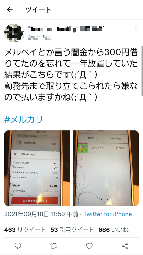 メルペイとか言う闇金から300円借りてたのを忘れて一年放置していた結果がこちらです(;´Д`) 勤務先まで取り立てこられたら嫌なので払いますかね(;´Д`) #メルカリ