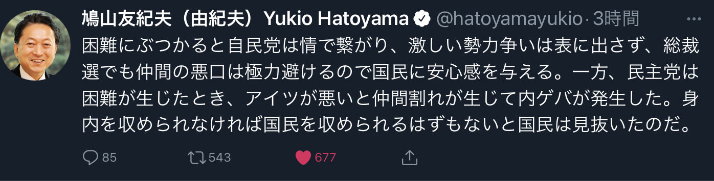 【悲報】鳩山由紀夫「自民党はなんだかんだで纏まるから国民に安心感を与える。民主党は内ゲバのゴミ」