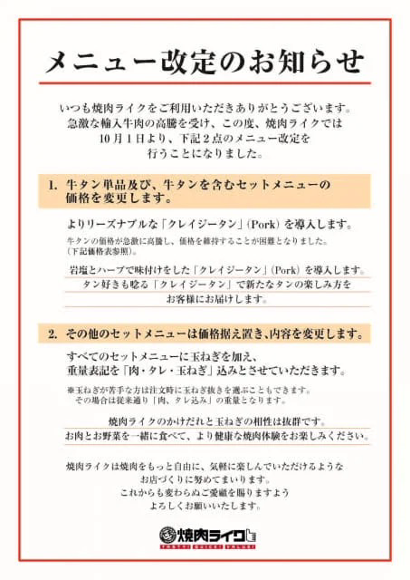 【画像】焼肉ライクさん、「肉・タレ・玉ねぎ」込み重量に変更してしまう・・・