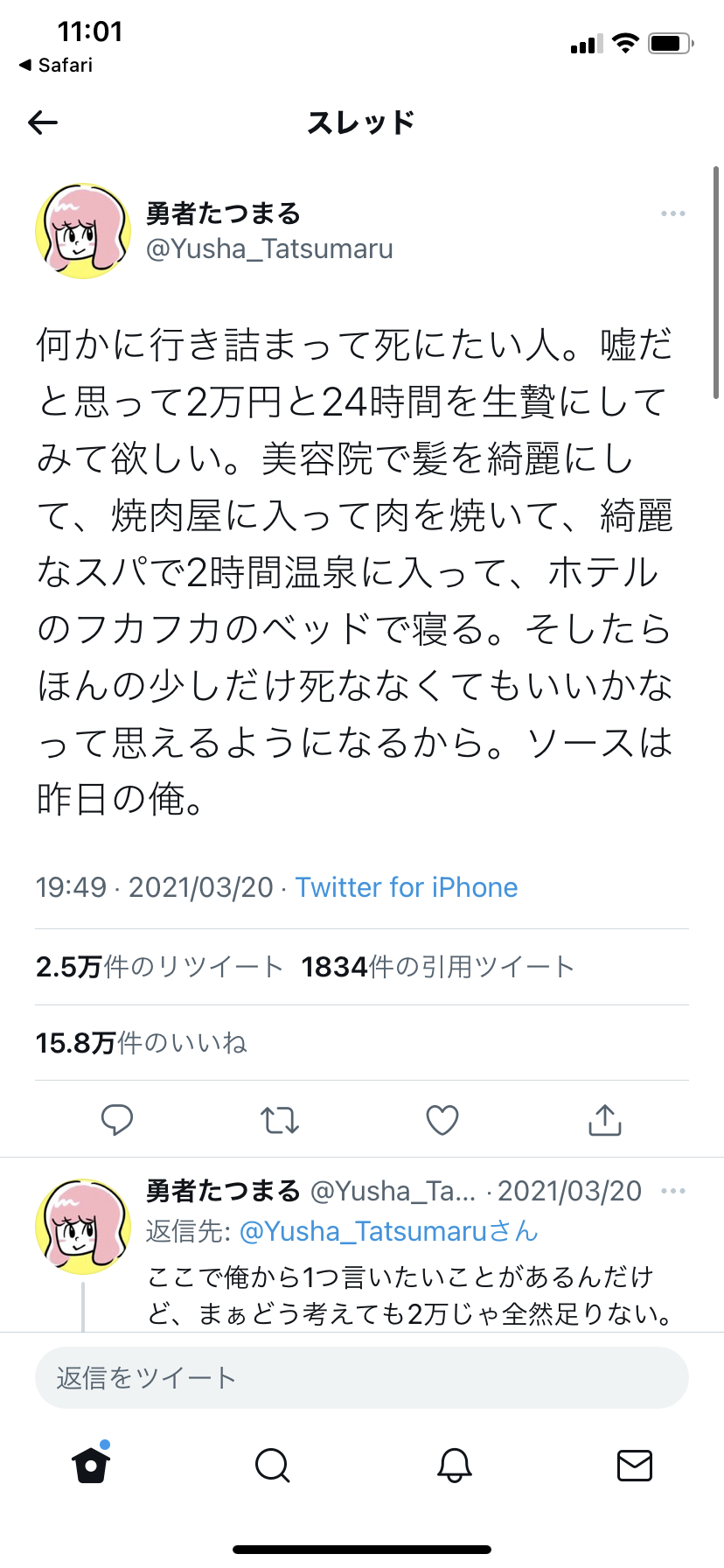 ツイッタラー「死にたいと思ってる人、2万円使えば生きたいと思うようになるぞ」