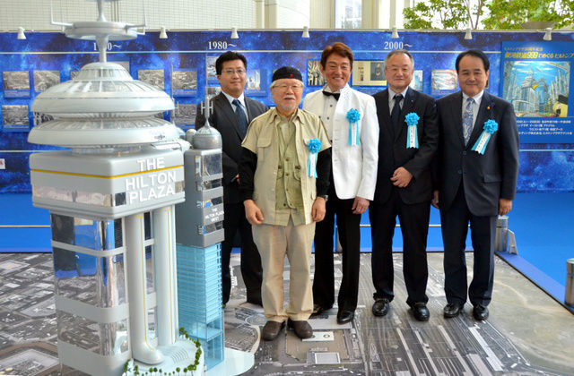 30年後の梅田周辺をイメージしたイラストを描いた松本零士さん(左から2人目)ら。