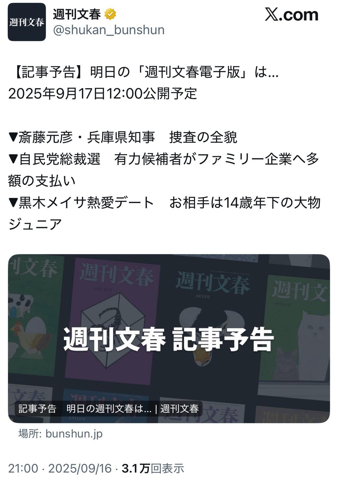 ホーム > 芸能 > 【朗報】黒木メイサとジュニア、熱愛と文春報道 2025/09/17 1: 以下、名無しにかわりましてネギ速がお送りします 2025/09/17(水) 08:04:24.08 ID:9IIqrPO50 マジか 3: 以下、名無しにかわりましてネギ速がお送りします 2025/09/17(水) 08:04:59.98 ID:i9kQu0lv0 千原ジュニアじゃないのか… 4: 以下、名無しにかわりましてネギ速がお送りします 2025/09/17(水) 08:05:01.66 ID:zH8DxGiiM 大きいのかジュニアなのかどっちやねん 続きを読む - 芸能