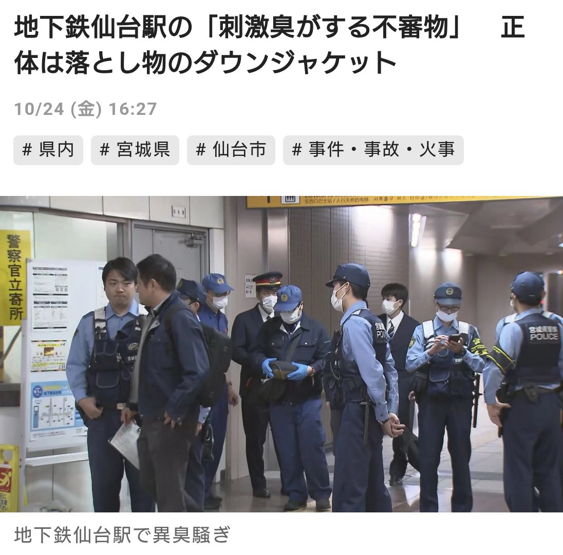 消防などによりますと24日午後3時27分ごろ、仙台市青葉区の仙台市地下鉄仙台駅の構内で、「不審物があり刺激臭がする」と通行人から消防に通報がありました。
