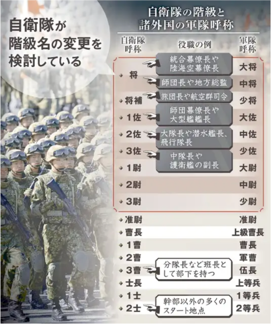 政府は12日、自衛隊の階級名を変更し、国際標準化させる検討に入った。複数の政府関係者が明らかにした。自衛隊は軍事色を弱めるため、独自の呼び方をしてきたが、諸外国の軍隊に準拠した呼称にすることで国民の自衛隊への理解を促進し、自衛官の地位向上と士気高揚につなげる。