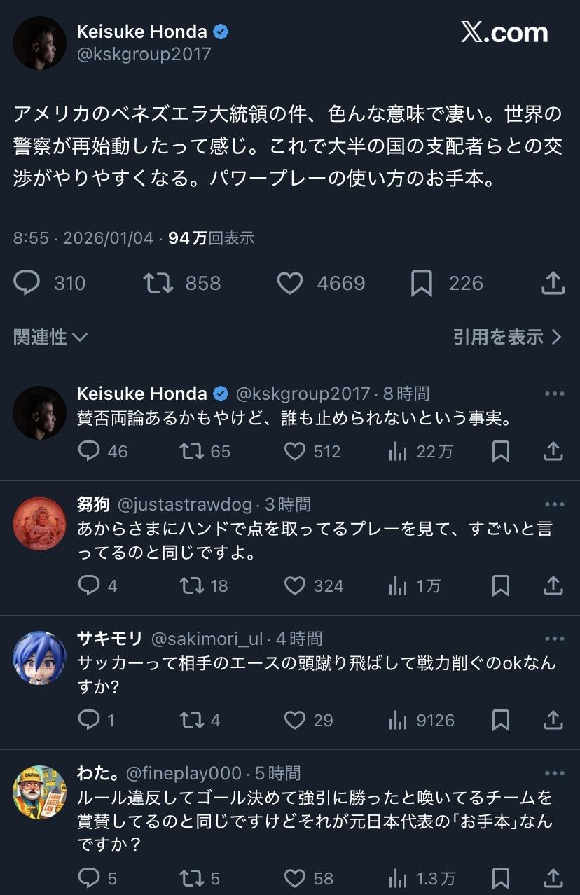 ホーム > 画像ネタ > 【画像】本田圭佑、物申す 2026/01/05 1: 以下、名無しにかわりましてネギ速がお送りします 2026/01/04(日) 18:09:20.80 ID:w8En8xrC0 2: 以下、名無しにかわりましてネギ速がお送りします 2026/01/04(日) 18:09:42.81 ID:DWwVzmAK0 草 3: 以下、名無しにかわりましてネギ速がお送りします 2026/01/04(日) 18:10:29.84 ID:3blaCiGK0 アスリートはSNSやらないほうがいいと思います 続きを読む - 画像ネタ