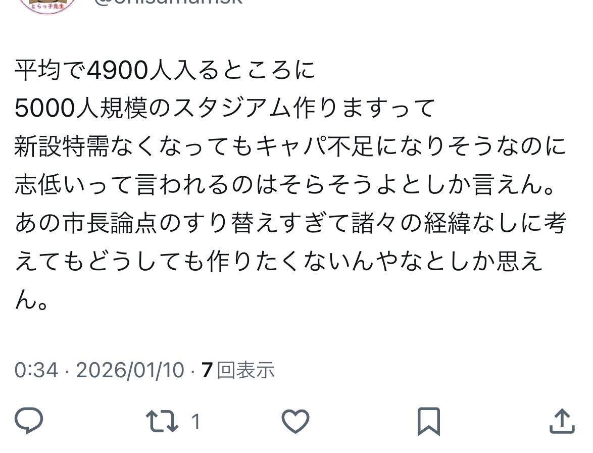 ホーム > 画像ネタ > 【画像】税リーグサポーター、怒り心頭「志低いって、そらそうよとしか言えん。」 2026/01/13 1: 以下、名無しにかわりましてネギ速がお送りします 2026/01/10(土) 00:40:50.30 ID:D2fNbFRc0 2: 以下、名無しにかわりましてネギ速がお送りします 2026/01/10(土) 00:41:28.23 ID:D2fNbFRc0 こいつ曰く、市長は話の論点をすり替えてどうしてもスタジアムを作りたくないって意見が見え見えらしい 3: 以下、名無しにかわりましてネギ速がお送りします 2026/01/10(土) 00:43:13.11 ID:D2fNbFRc0 わかりやすく巨人を引き合いに出してる 続きを読む - 画像ネタ