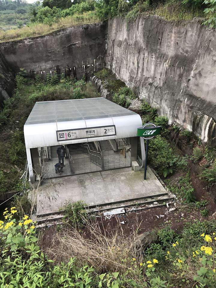 画像には、2015年に建設が完了した重慶市の駅の改札がうつっている。しかし3つの出口のうち使われているのは1つだけで、残りの2つの出口は荒れ果て、草が生えている。