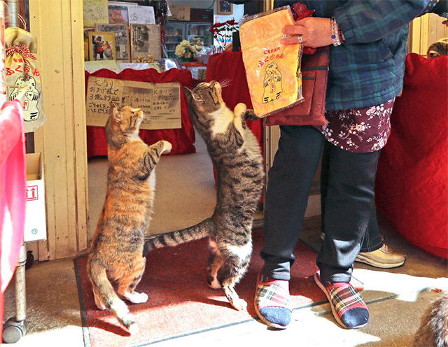 高島に上陸後、宝当神社への参道を進むとすぐ、数匹の猫が行儀良く並ぶ商店に足を止めずにはいられないだろう。