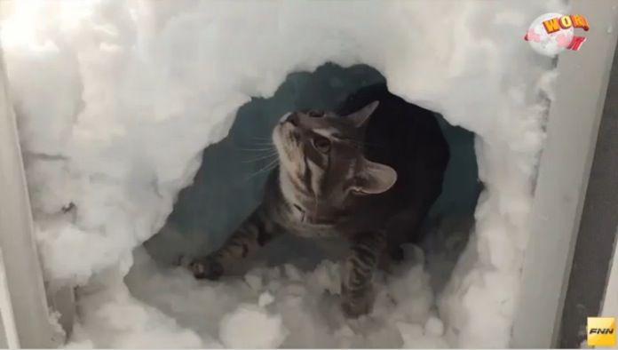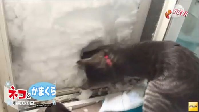 大雪に見舞われたコロラド州で、ガラス戸の外に降り積もった分厚い雪を、口や足を使って、せっせとくり抜いていく猫。